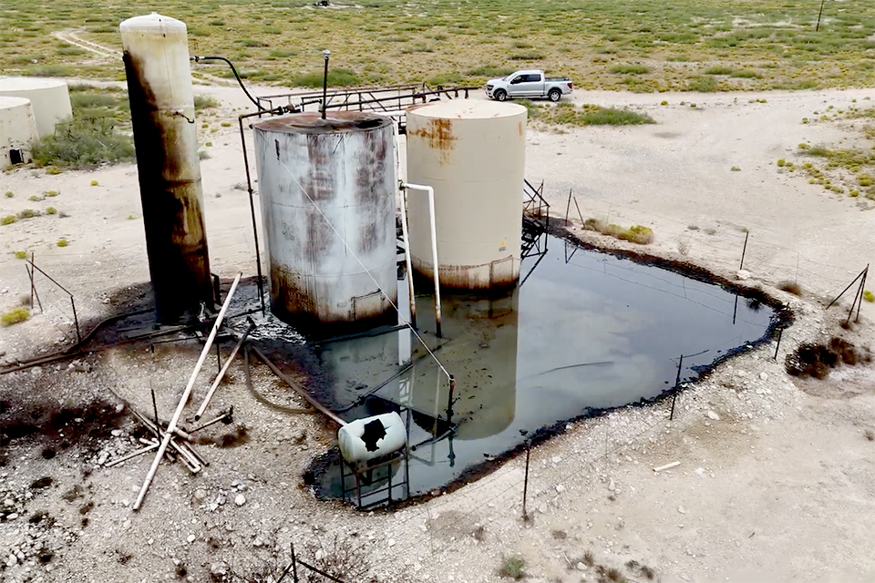 Drone footage captured nearby revealed another abandoned well site surrounded by a large pool of oil and polluted water, clearly visible on the ground around the tanks and well equipment.